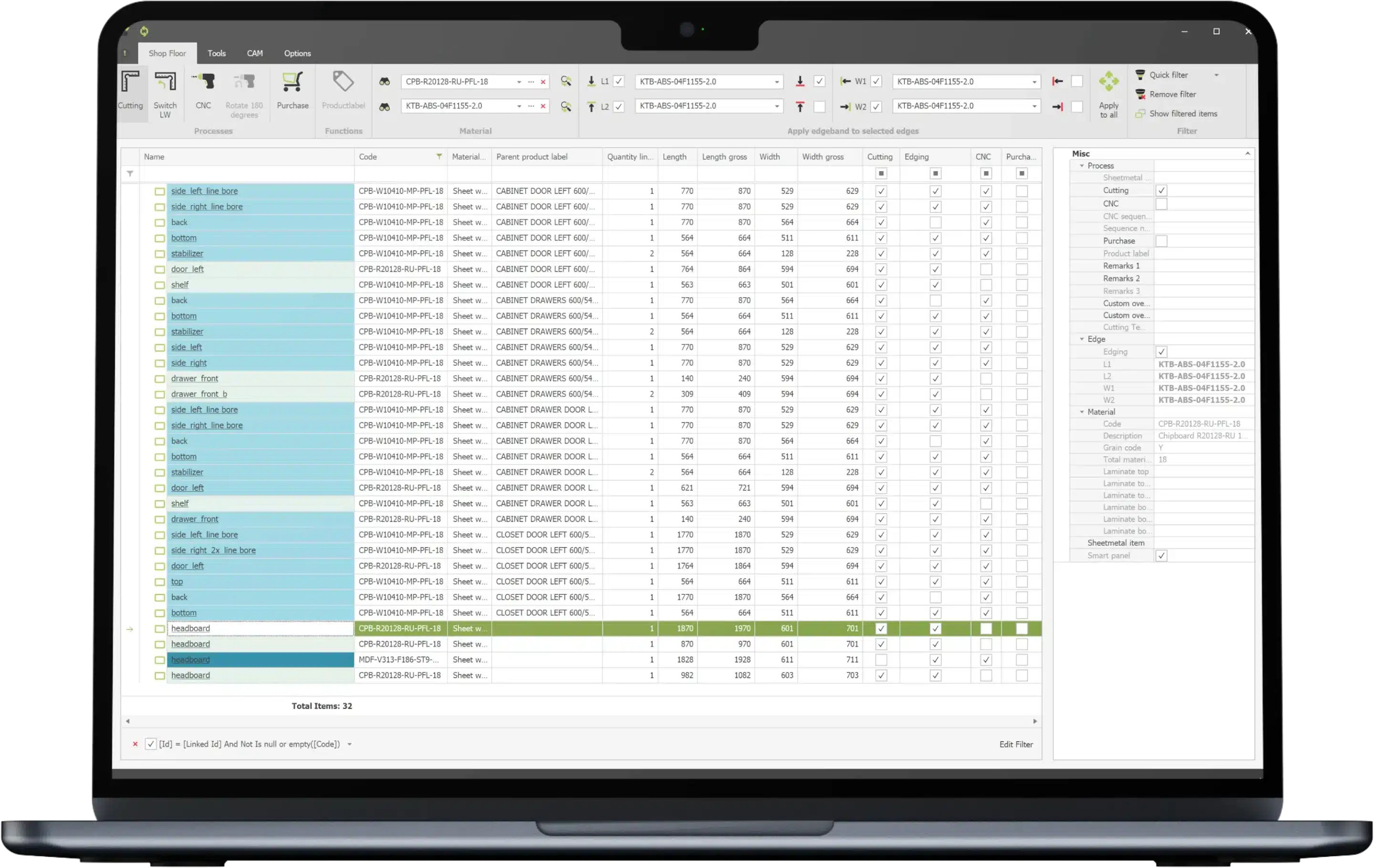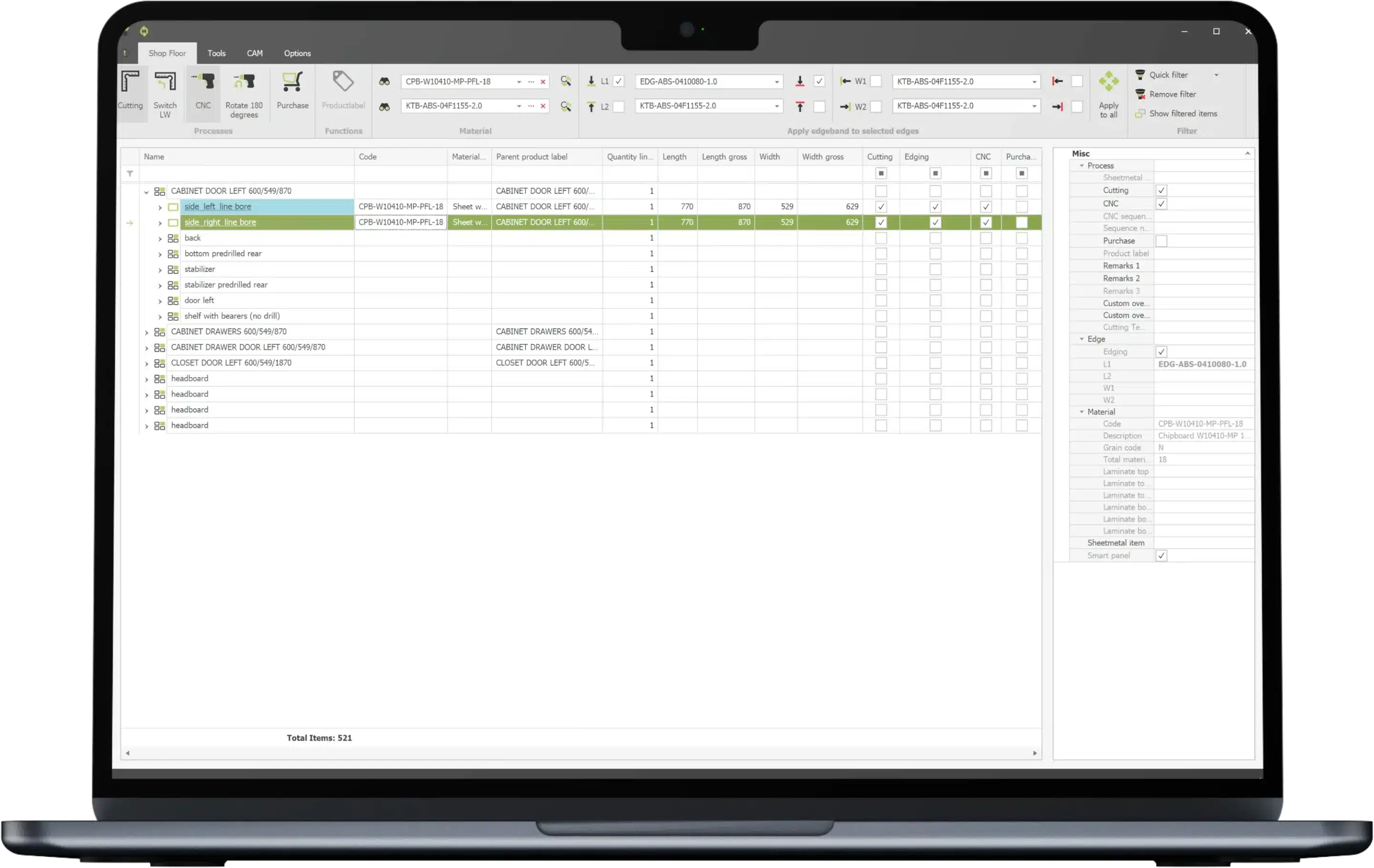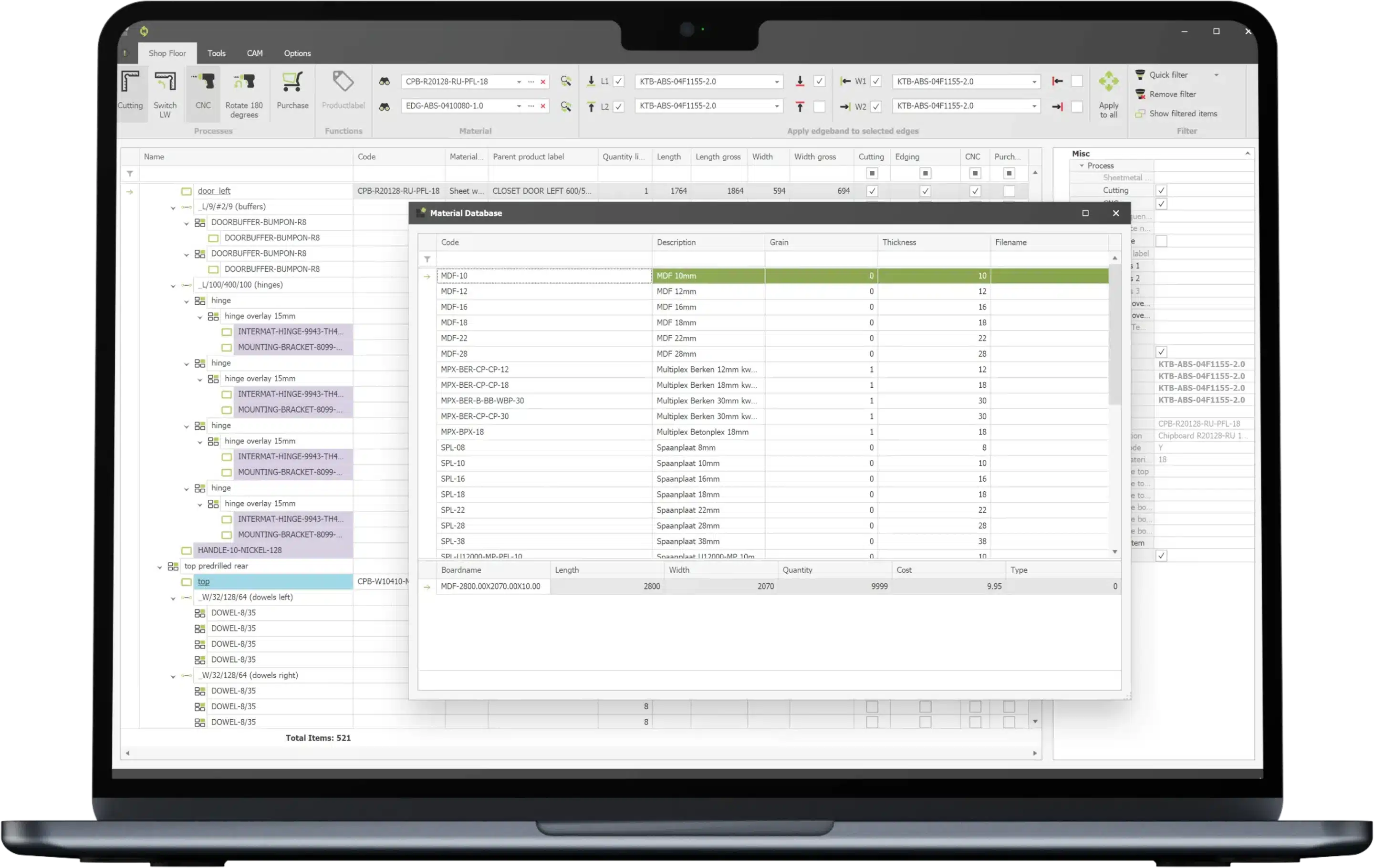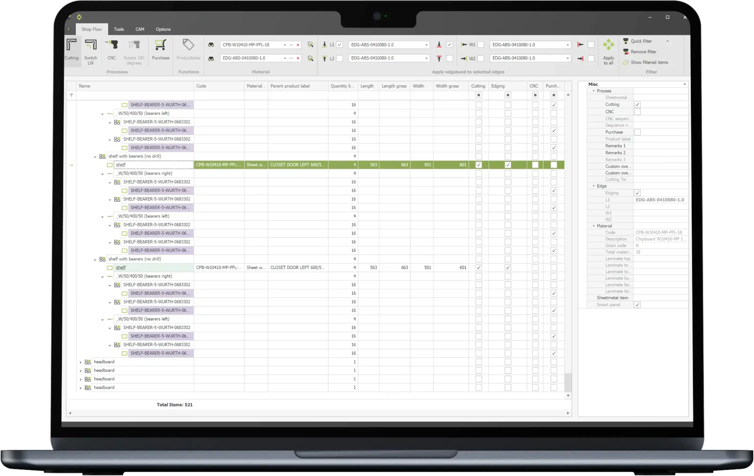 Para-Flex automatiseert het genereren van zaaglijsten, inkooplijsten, plaatoptimalisatie, rapporten en NC-code, zodat ontwerpwijzigingen direct en nauwkeurig worden doorgevoerd.