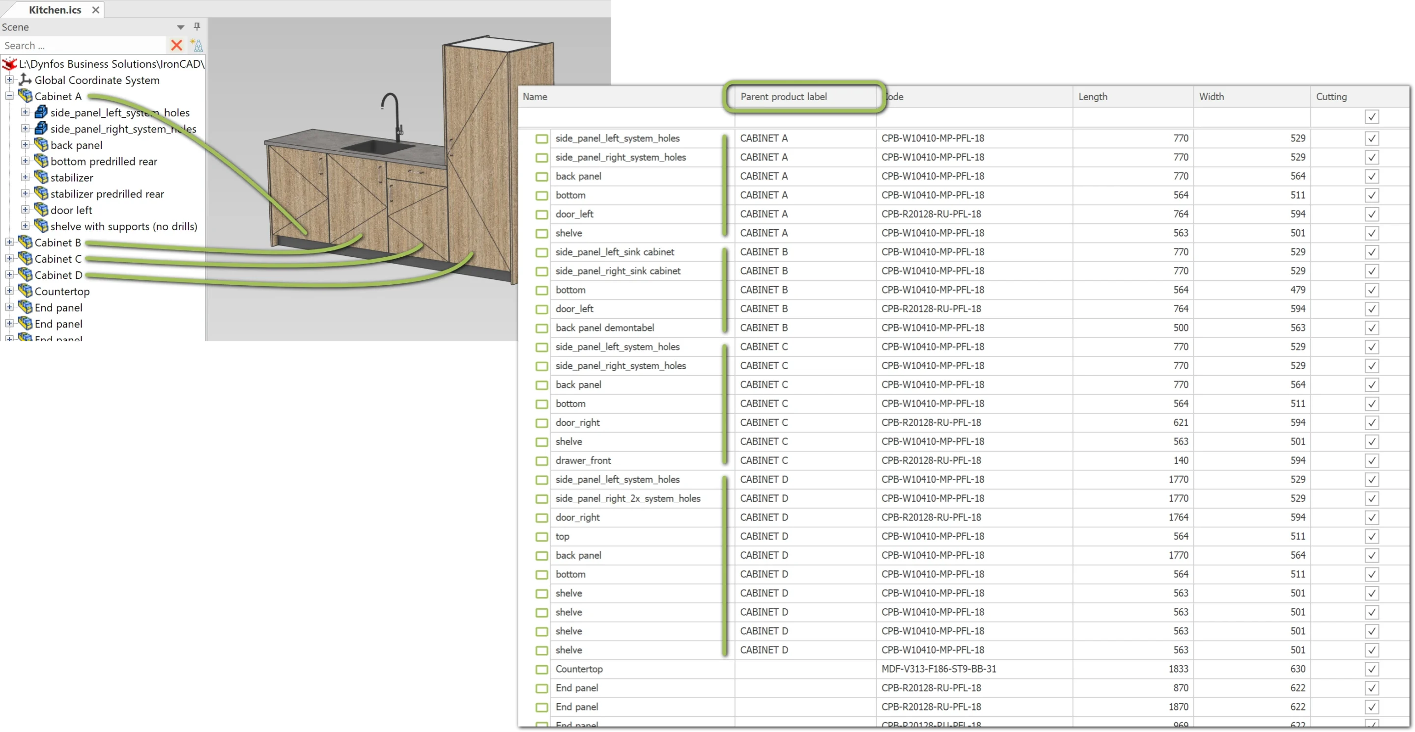 A tag can be added to Assemblies, to identify parts during further progressing. Products can than be easily be distinguished from each other and grouped on output, like a cutting lists or label printers. This is useful when multiple parts have the same name (for example, “Front”); they can then be linked to the cabinet they belong to.